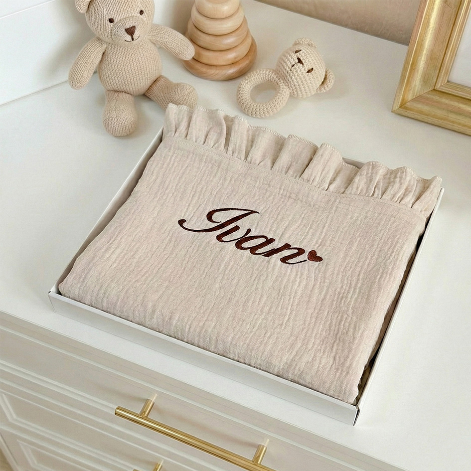 Naša personalizirana dekica od muslina stvorena je da bude upravo to-onaj jedan, poseban predmet, koji prati vašu bebu od prvog izlaska iz bolnice, preko vožnje kolicima, pa sve do najslađih snova u krevetiću.