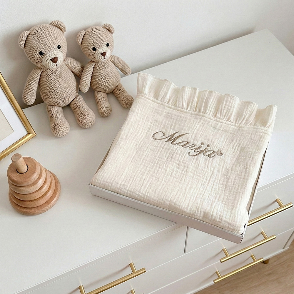 Naša personalizirana dekica od muslina stvorena je da bude upravo to-onaj jedan, poseban predmet, koji prati vašu bebu od prvog izlaska iz bolnice, preko vožnje kolicima, pa sve do najslađih snova u krevetiću.