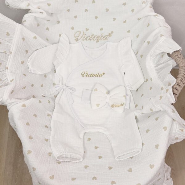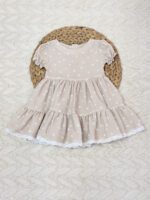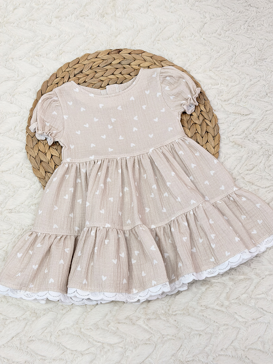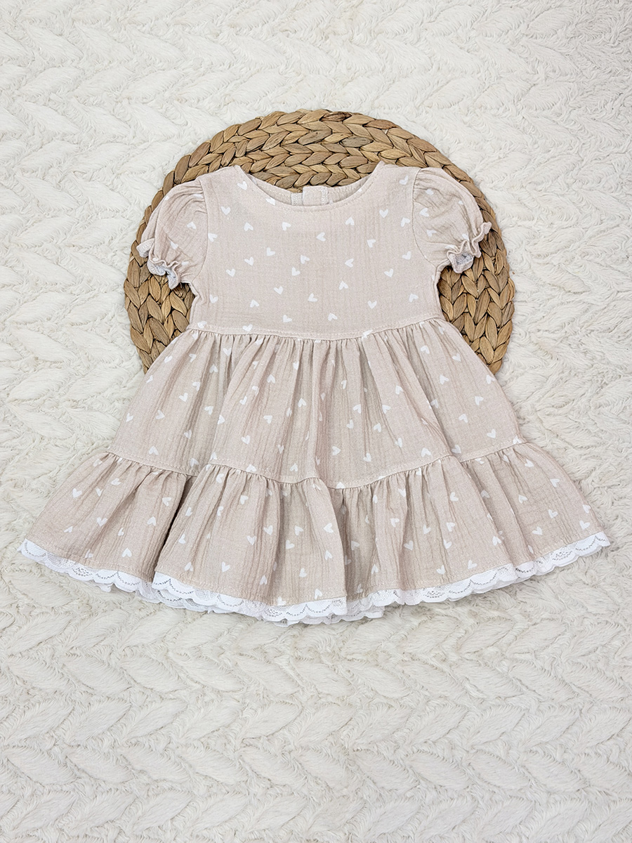 Najnježniji, prozračni muslin za najposebnije trenutke vaše djevojčice. Vaša djevojčica će zablistati u ovoj nježnoj haljini od muslina sa prekrasnim uzorkom bijelih srčeka.