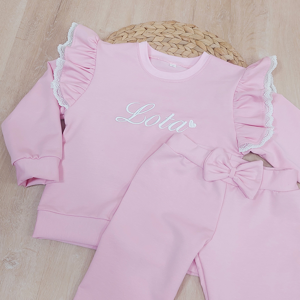 Posebnost ovog kompleta, osim personalizacije vezom, su i volančići sa dodatkom čipke.