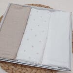 U setu dolaze 3 komada pelena, dimenzija 70x70cm (+/- 2cm) pakiranih u kutiju.