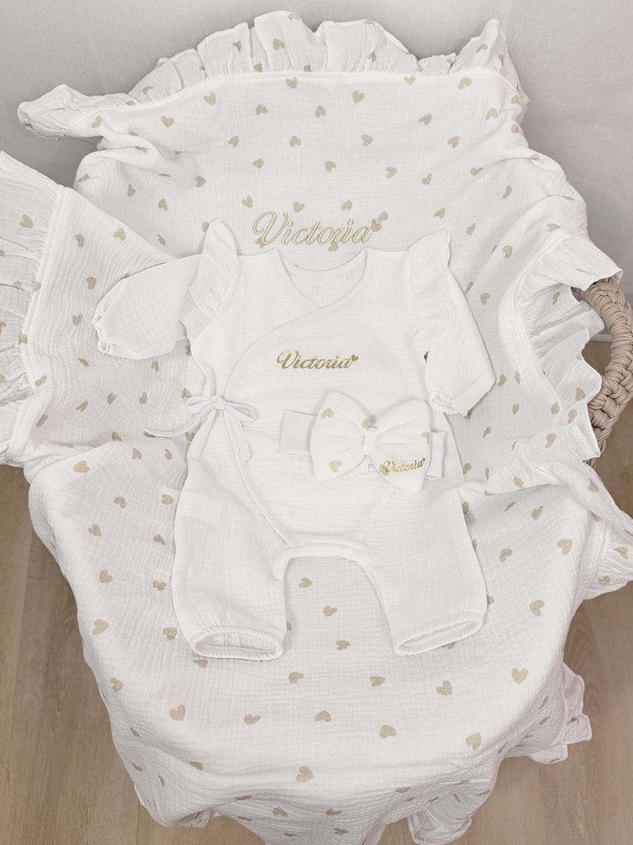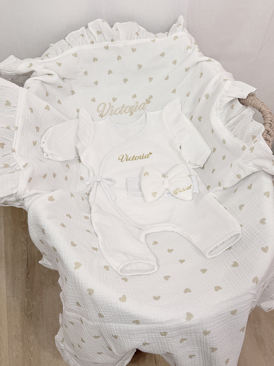 Svi proizvodi izrađeni su od kvalitetnog muslina-prirodnog, prozračnog i nježnog materijala koji je savršen za osjetljivu bebinu kožu. Personalizacija imenom daje ovom setu posebnu, emotivnu vrijednost i čini ga uspomenom za cijeli život.