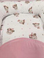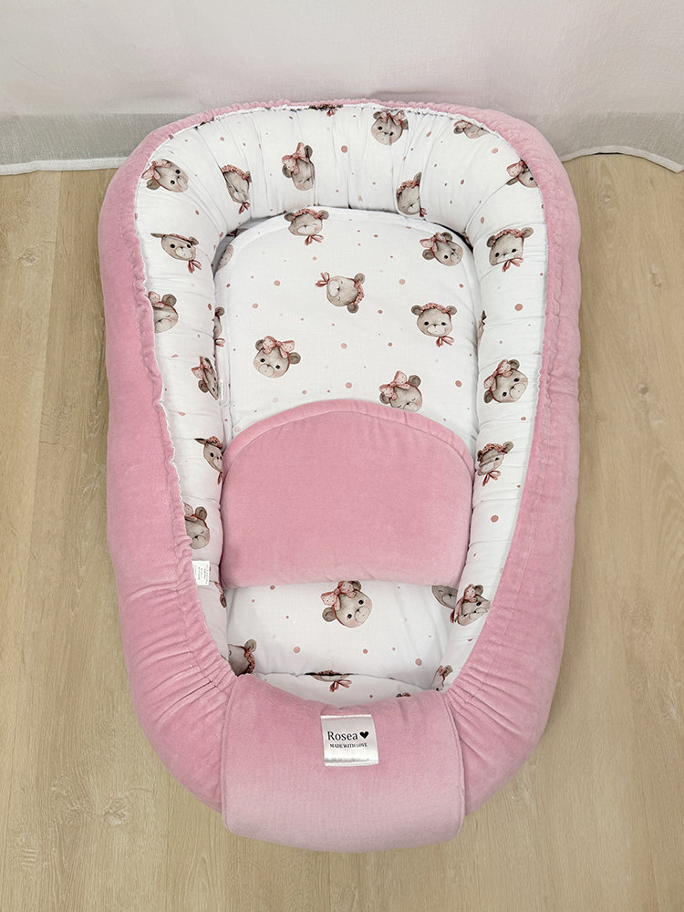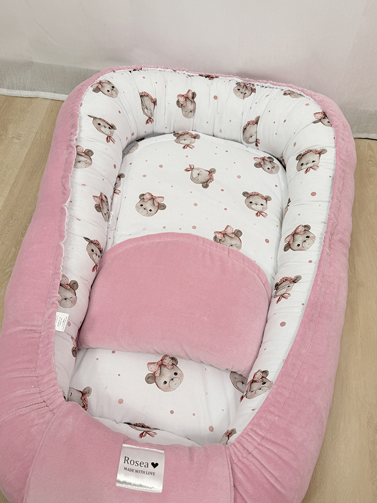 Naše dvostrano gnijezdo za bebe napravljeno je s posebnom pažnjom-s jedne strane je mekani, pamučni velur, a s druge strane 100% prirodni pamuk s predivnim uzorkom. Birate stranu koju želite tako da gnijezdo samo okrenete, a isto tako birate stranu podloška koji dolazi uz gnijezdo.