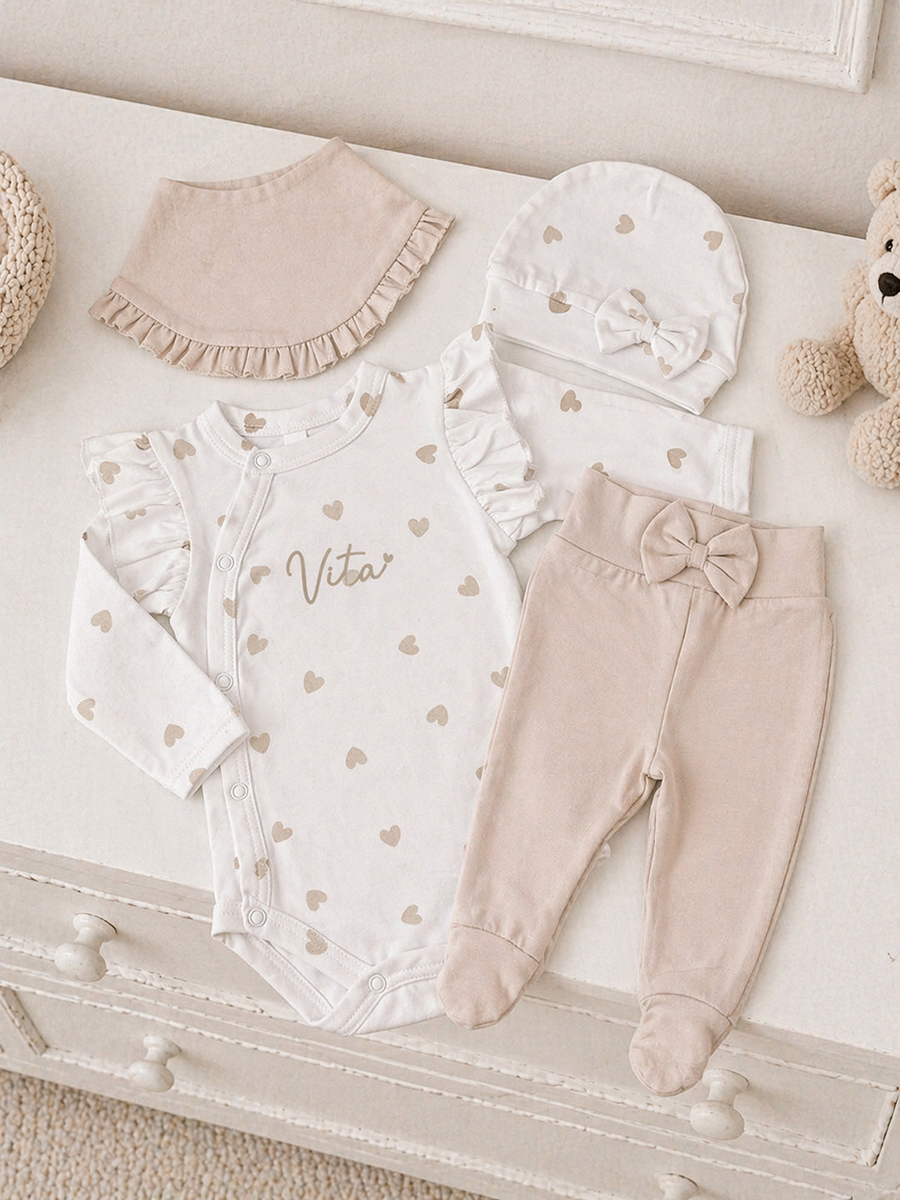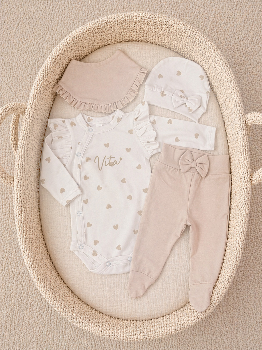 Sastoji se od četiri pažljivo odabrana proizvoda izrađenih od mekanog pamuka, idealnog za osjetljivu kožu novorođene bebice. Dodatno se mogu personalizirati imenom vaše bebe.