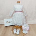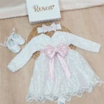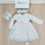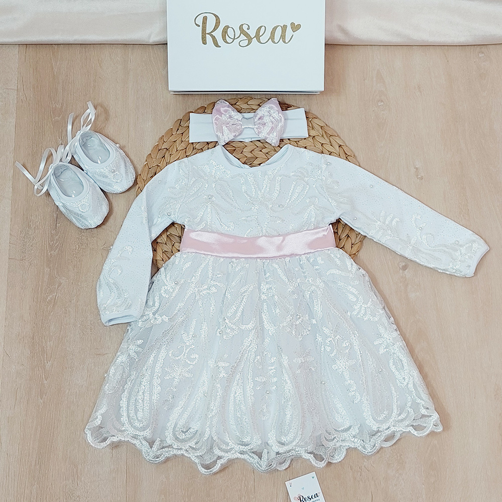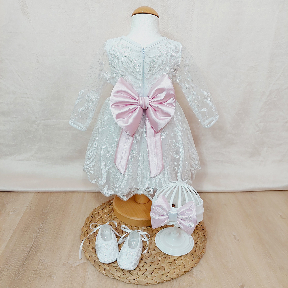 Trakica za kosu i cipelice prilagođeni su haljinici. Cipelice šivamo samo do veličine 86.