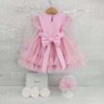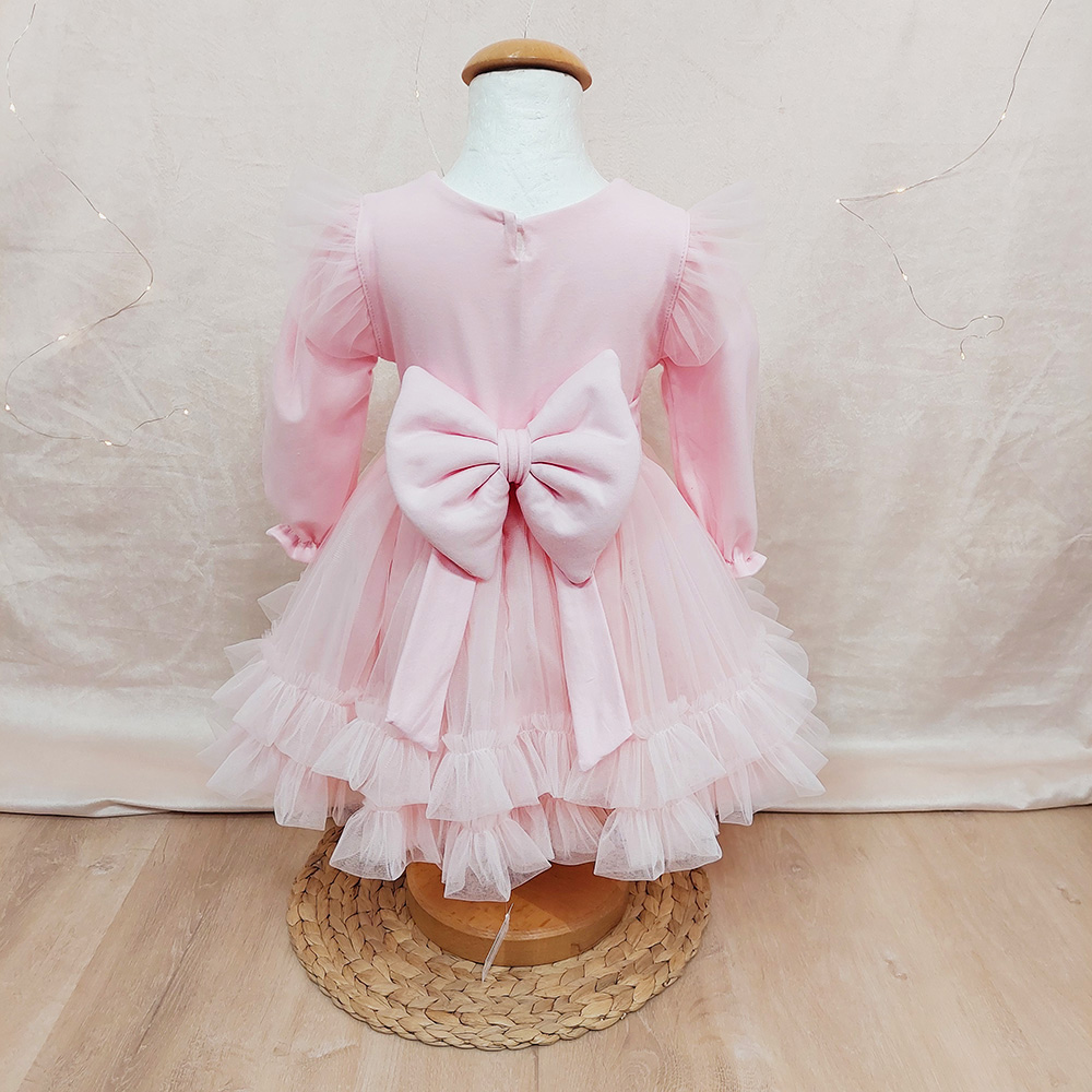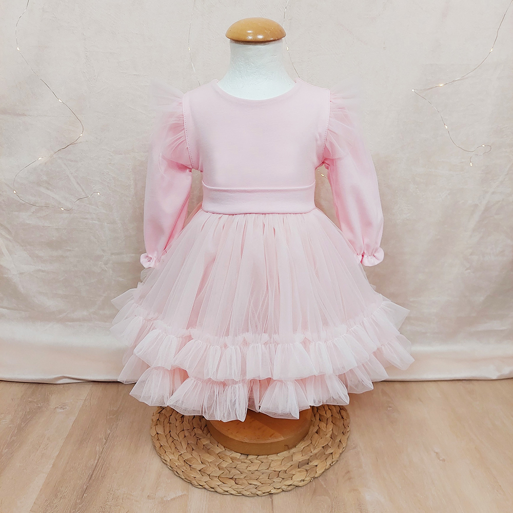 Prekrasna haljina bogata tilom za posebne prilike vaše princeze. Njenu raskoš čine pufasti rukavi sa dodatkom volana na ramenu, te volančići na rubu same haljine.🤍