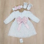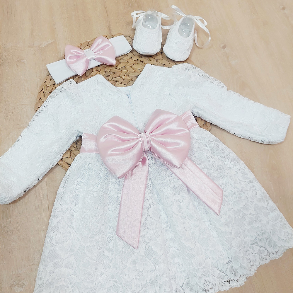 Trakica za kosu i cipelice prilagođeni su haljinici. Cipelice šivamo samo do veličine 86.