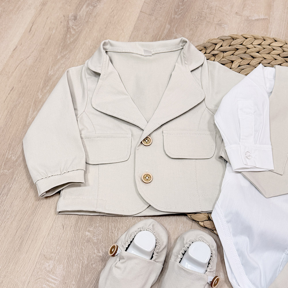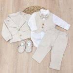 Naše elegantno dječje odijelo sastoji se od pamučne bodi košulje (ili klasične košulje), leptir mašne, prsluka i elegantnih hlača s džepovima.
