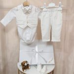 Naše elegantno dječje odijelo sastoji se od pamučne bodi košulje (ili klasične košulje), leptir mašne, prsluka i elegantnih hlača s džepovima.