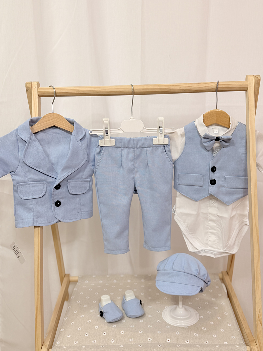 Ovo elegantno dječje odijelo sastoji se od pamučne bodi košulje (ili klasične košulje), leptir mašne, prsluka, i hlača s praktičnim džepovima, a kao dodatke birate kapu, sako ili cipelice u istom materijalu kao odijelo.