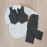 Naše elegantno dječje odijelo sastoji se od pamučne bodi košulje (ili klasične košulje), leptir mašne, prsluka i hlača s praktičnim džepovima.