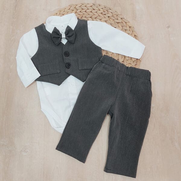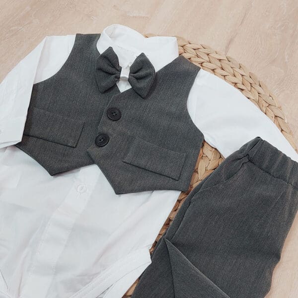 Naše elegantno dječje odijelo sastoji se od pamučne bodi košulje (ili klasične košulje), leptir mašne, prsluka i hlača s praktičnim džepovima.