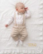 Naše elegantno dječje odijelo sastoji se od pamučne bodi košulje (ili klasične košulje), leptir mašne, tregera koji se mogu skinuti, i hlača s praktičnim džepovima.
